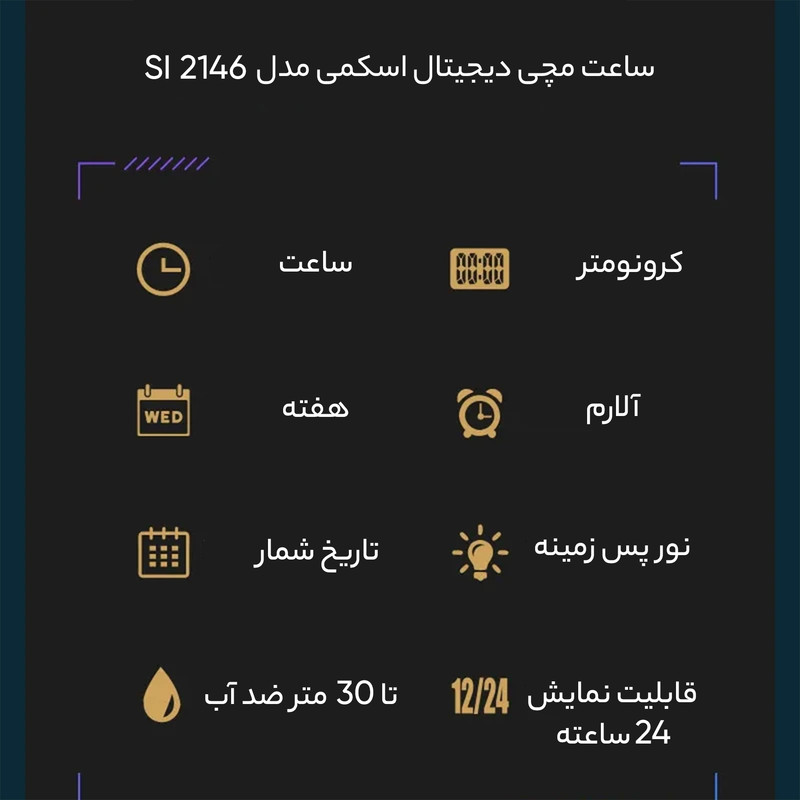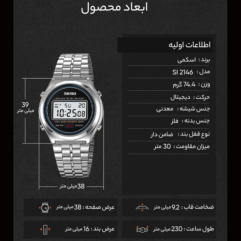 این روزها دیگر همه به تاثیر ساعت بر تیپ و استایل آگاهی کامل دارند. کمتر کسی پیدا می شود که تصور کند یک ساعت فقط کالایی برای نشان دادن زمان است.هر چه جلوتر می رویم جای خالی این محصول لوکس و زیبا را روی مچ خیلی از افراد مشاهده می کنیم. زیرا این روزها صنعت مد و فشن رابطه مستقیمی با استفاده از این اکسسوری جذاب دارد.شاید به نظر شما آنقدری که میگویند خرید یک ساعت شیک و استفاده از آن اهمیت نداشته باشد، اما بد نیست بدانید که اگر در انتخاب خود دقت کرده باشید و متناسب با آن پوشش مناسب را انتخاب کنید، آن ساعت مچی شگفت انگیز می تواند غوغایی در ظاهر شما بپا کند. شاید در نگاه نخست این زیبایی و جذابیت خیلی محسوس نباشد، اما یقینا تاثیرش را بر ناخودآگاه بینندگان خواهد گذاشت. ساعت های مچی به عنوان یک همراه همیشگی مناسب هر مکانی هستند. باشگاه ورزشی، استخر شنا، مسافرت، محل کار، قرار های دوستانه و در کل برای استفاده روزمره مناسب هستند. شرکت اسکمی با ارائه مدل های مختلف اینبار ساعتی فوق العاده جذاب با تنوع رنگی چشم نواز را به تولید رسانده است.در این مدل به دلیل طراحی و رنگ بندی جذاب که در آن بکار رفته است حس خوشایندی را به شما و طرف مقابل القا میکند.از قابلیت های این ساعت میتوان به ضد آب تا عمق 50 متر , کرنومتر , آلارم , نمایش 12/24 ساعته , چراغ صفحه , تقویم .... اشاره کرد.با توجه به سایز استاندارد این ساعت مناسب آقایان و خانم ها میباشد.